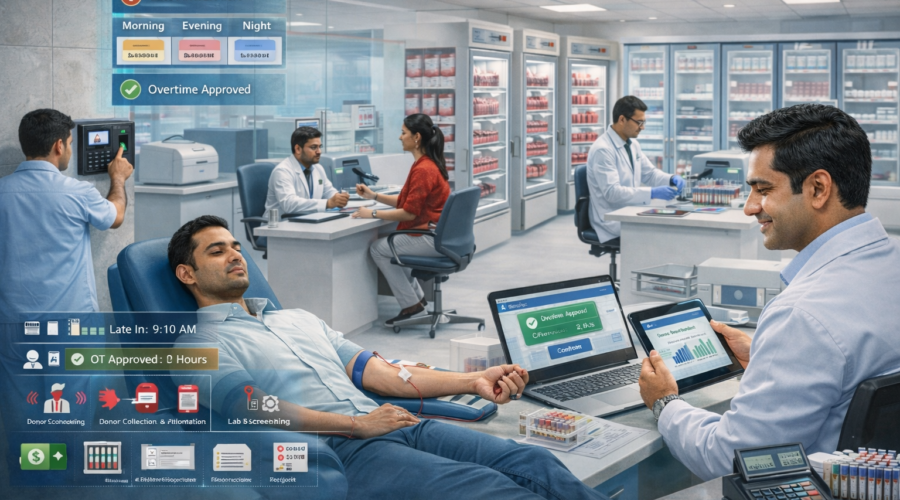 MG Modi Group Modi Group hai toh mumkin hai aapki Z+ security Get Quote WhatsApp Demo Call Blood Banks – Staff Attendance + 24x7 Multi-Shift + Donor Counselling/Collection/Lab Screening Duty Mapping + Late/Early Rules + OT Approval + Cold Storage & Inventory Role Tracking + Compliance Reports + Payroll Export