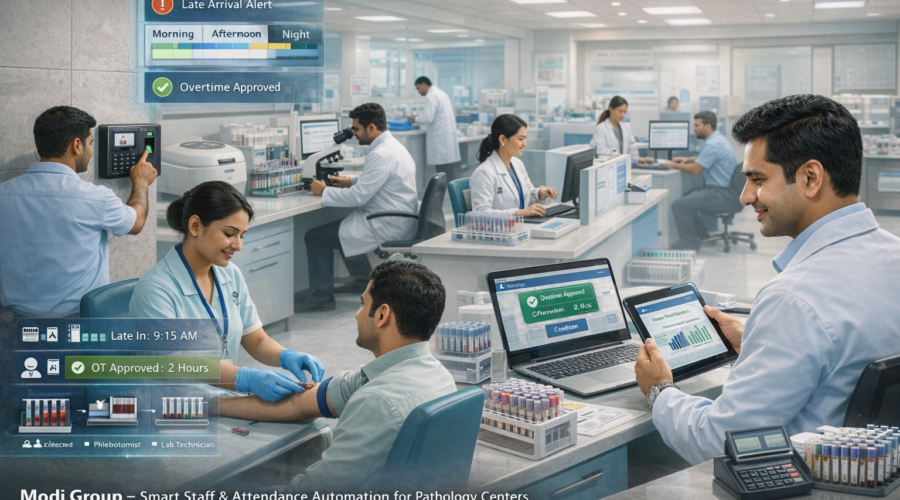 MG Modi Group Modi Group hai toh mumkin hai aapki Z+ security Get Quote WhatsApp Demo Call Pathology Centers – Staff Attendance + Multi-Shift + Sample Collection & Processing Duty Mapping + Late/Early Rules + OT Approval + Technician/Phlebotomist Role Tracking + Report Dispatch + Payroll Export Automation | Modi