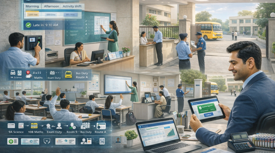 MG Modi Group Modi Group hai toh mumkin hai aapki Z+ security Get Quote WhatsApp Demo Call Private Schools – Staff Attendance + Multi-Shift + Teacher/Non-Teaching Duty Roster Mapping + Late/Early Rules + OT Approval + Class/Bus Duty/Exam Invigilation Tracking + Visitor Gate Security Mapping + Payroll Export Automation |