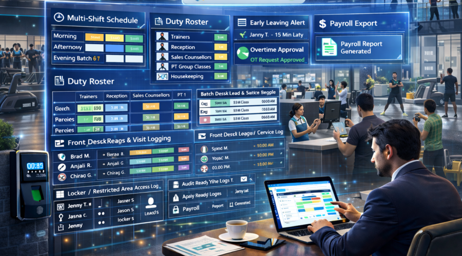 Gyms – Staff Attendance + Multi-Shift + Trainers/Reception/Sales Counsellors/Personal Training (PT)/Group Classes/Housekeeping Role Mapping + Late/Early Rules + OT Approval + Batch/Class Schedule Tracking + Front Desk Lead & Visit Logging + Locker/Restricted Area Access Control + Audit-Ready Logs + Payroll Export Automation | Modi Group ✅