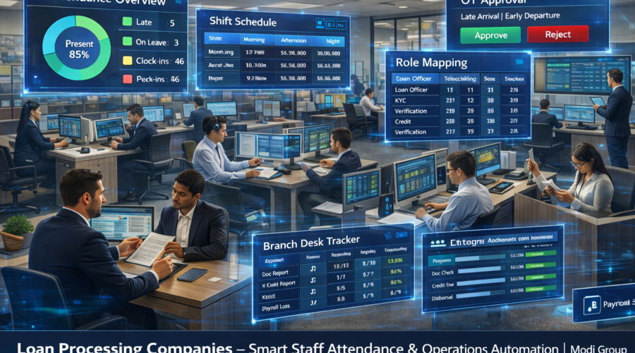 Loan Processing Companies – Staff Attendance + Multi-Shift + Loan Officers/Telecalling/KYC/Verification/Credit/Operations/Disbursal Role Mapping + Late/Early Rules + OT Approval + Branch-wise Desk/Counter Tracking + Audit-Ready Logs + TAT Control + Payroll Export Automation | Modi Group ✅