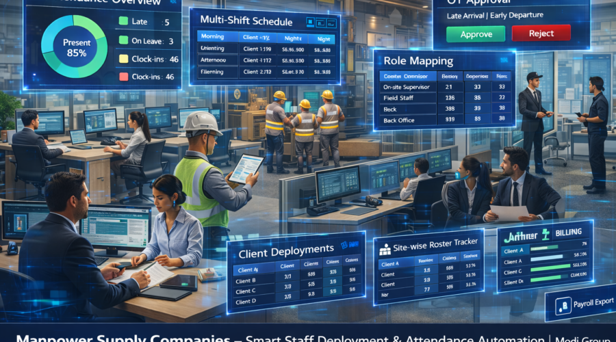 Manpower Supply Companies – Staff Attendance + Multi-Shift + Client-wise Deployment/On-Site Supervisors/Field Staff/Back Office Role Mapping + Late/Early Rules + OT Approval + Site-wise Roster & Client Billing Control + Audit-Ready Logs + Payroll Export Automation | Modi Group ✅