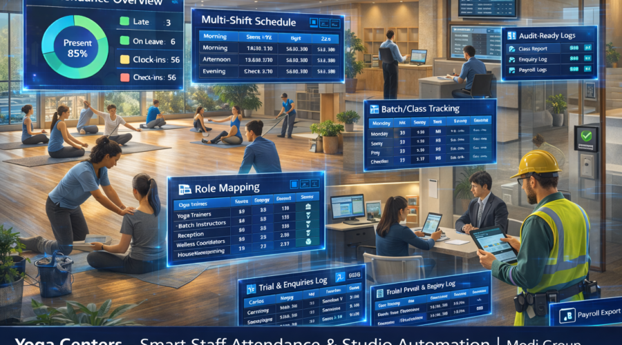 Yoga Centers – Staff Attendance + Multi-Shift + Yoga Trainers/Batch Instructors/Reception/Sales Counsellors/Wellness Coordinators/Housekeeping Role Mapping + Late/Early Rules + OT Approval + Batch/Class Schedule Tracking + Trial Session & Enquiry Logging + Studio Access Control + Audit-Ready Logs + Payroll Export Automation | Modi Group ✅